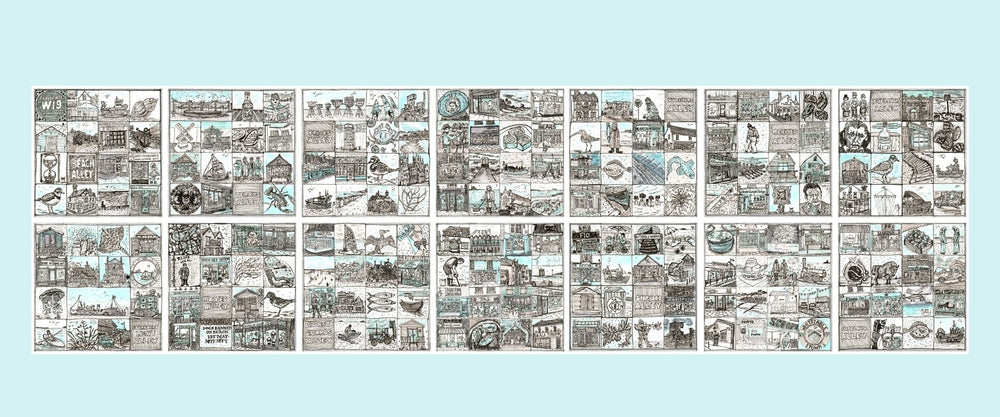 Almost all the images were drawn from the artists own photographs taken during her walks around the town with some very occasional online research for the birds, plants, seaweed, fish native to the North Kent coast.